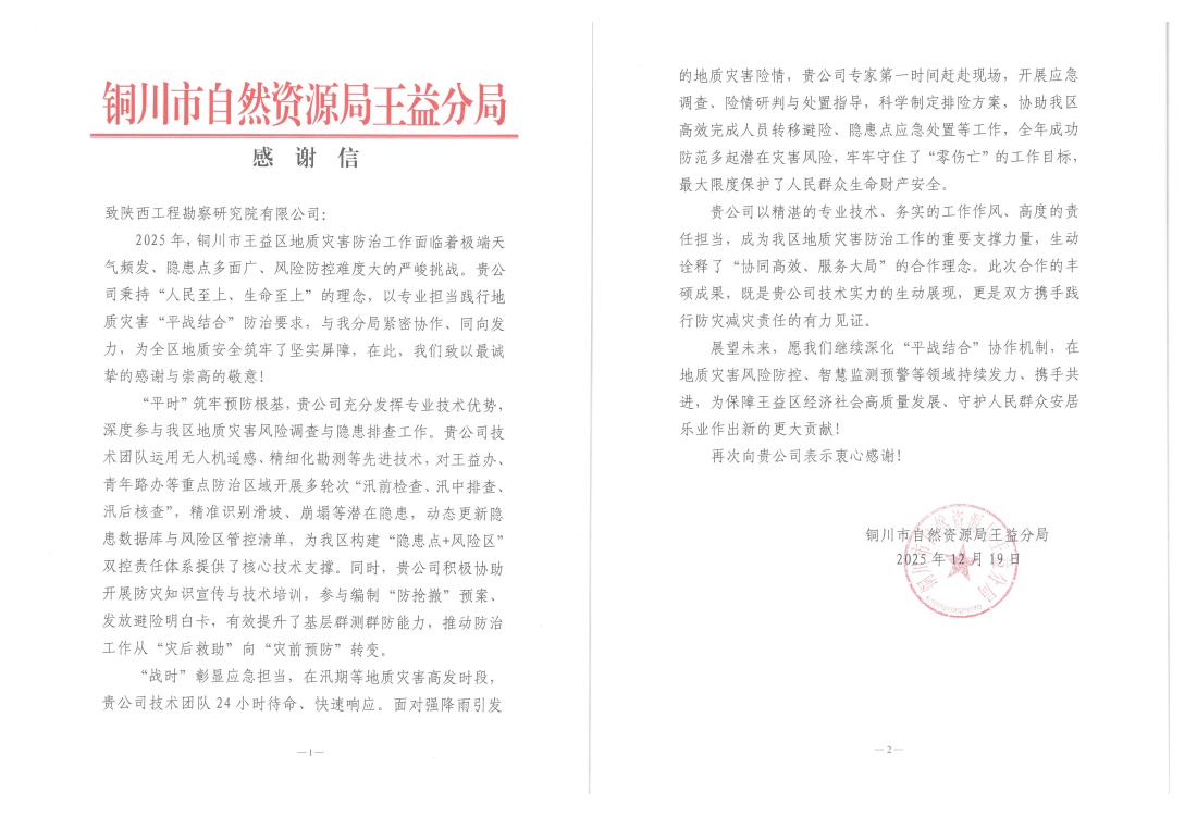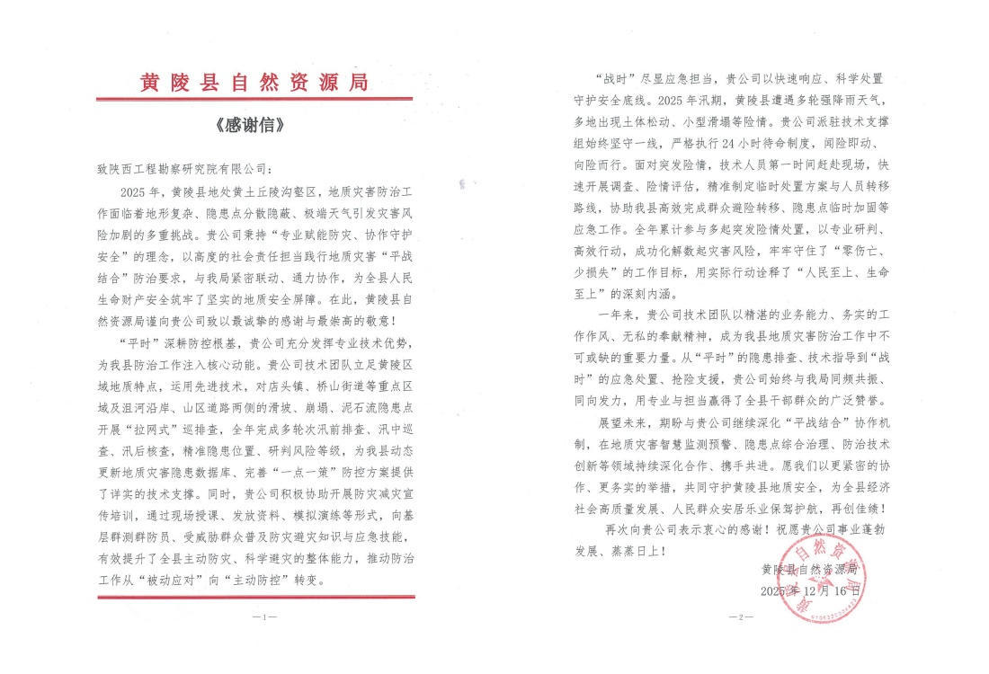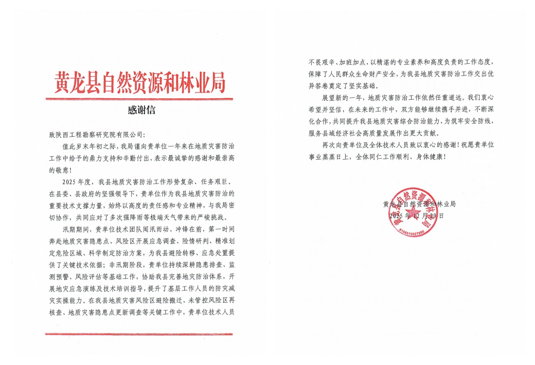 近日,公司接連收到黃陵縣、王益區(qū)、黃龍縣自然資源部門發(fā)來的感謝信,對公司在2025年度地質(zhì)災(zāi)害技術(shù)支撐工作中表現(xiàn)出的專業(yè)能力、高效響應(yīng)與奉獻(xiàn)精神給予高度評價和誠摯感謝。