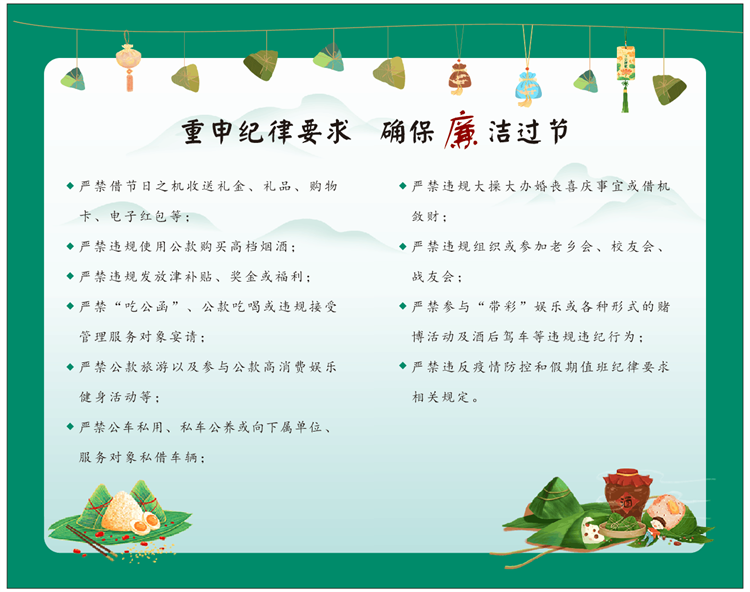 定制廉潔提醒卡。端午廉潔提醒卡內(nèi)容經(jīng)過(guò)精選,融合廉潔提醒、“十個(gè)嚴(yán)禁”、端午詩(shī)詞鑒賞等內(nèi)容,在品味端午文化的同時(shí),為全體黨員干部職工擰緊紀(jì)律“發(fā)條”,確保風(fēng)清氣正過(guò)端午。