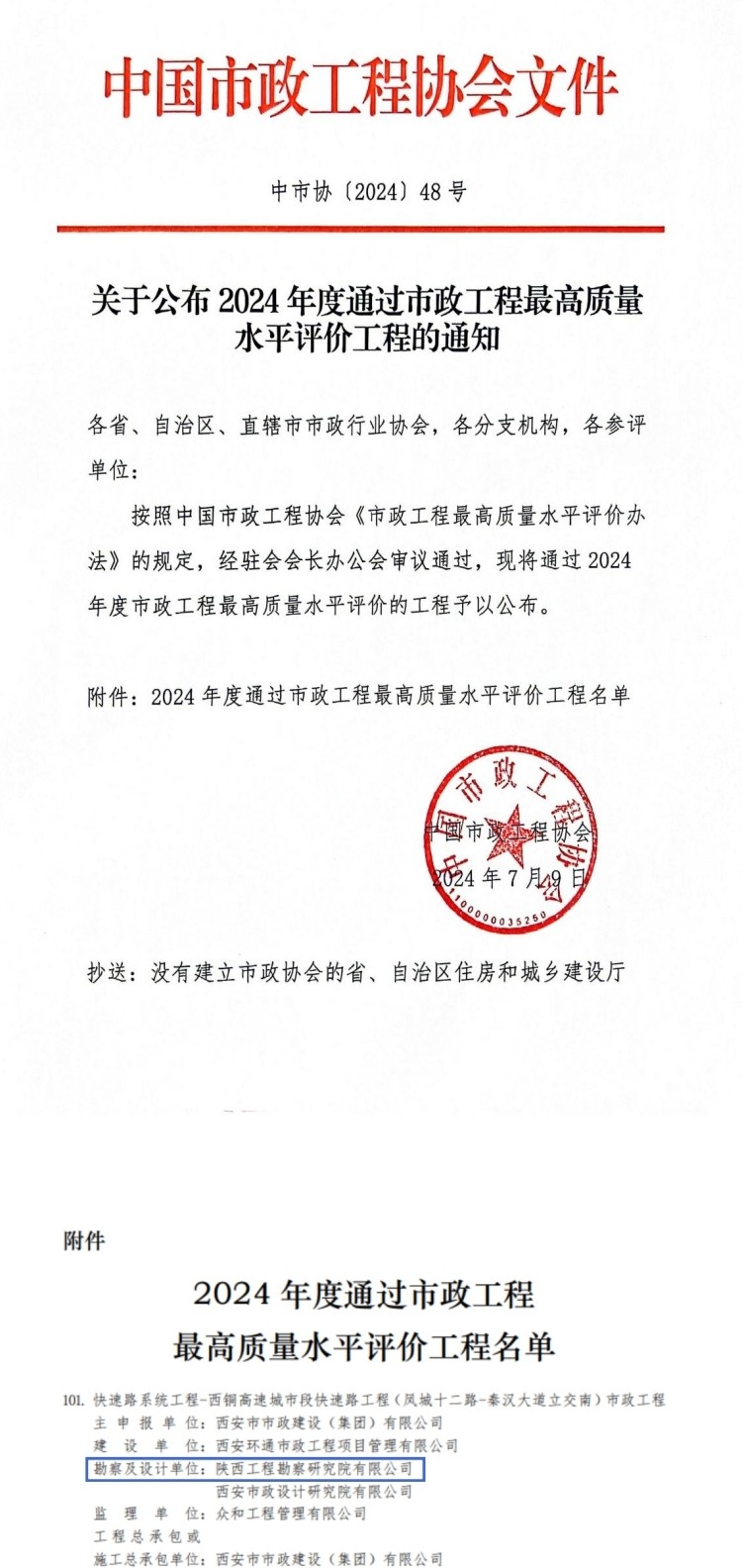 7月9日,中國市政工程協(xié)會公布了2024年度市政工程最高質量水平評價工程名單,陜西工勘院參建項目名列其中,再次榮獲中國市政工程最高質量水平評價。