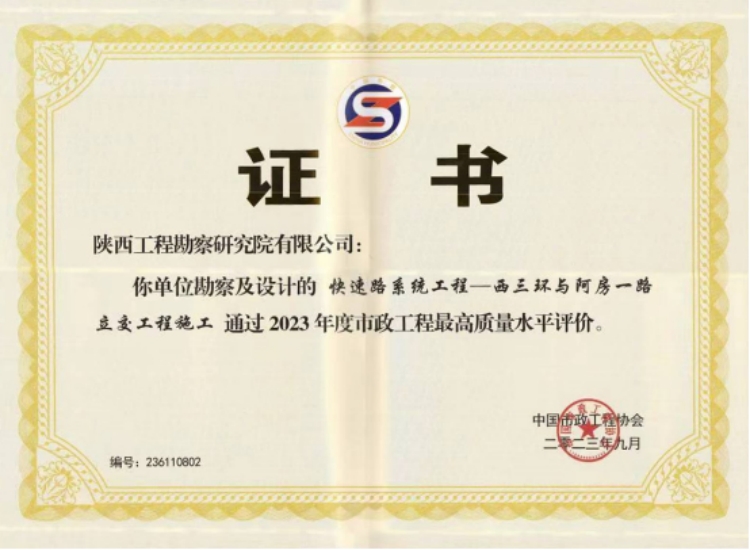 該獎項由中國市政協(xié)會組織實施,代表市政工程行業(yè)同時期國內先進水平,獲獎要求高,評選程序嚴格,是我國市政行業(yè)在工程質量方面的最高榮譽。此前由我公司負責勘察的西三環(huán)與阿房一路立交工程施工項目獲2023年度市政工程最高質量水平評價,今年西銅高速城市段快速路工程(鳳城十二路-秦漢大道立交南)市政工程又獲2024年度市政工程最高質量水平評價。連續(xù)兩年榮獲該項“國字”榮譽,充分展示出公司近年來在勘察領域扎實的專業(yè)功底及人才培養(yǎng)方面取得的突出成效。